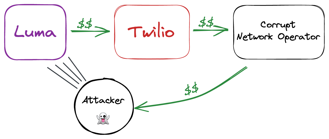 After some research, I figured out that the attackers were doing SMS Traffic Pumping. SMS Traffic Pumping takes advantage of referral fees offered by some shady mobile network operators. In this scheme, Luma pays Twilio per text, Twilio pays the mobile network operator, and the network gives a kickback to the hacker who attacked us.